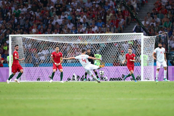 Trong trận đấu với Tây Ban Nha, Bồ Đào Nha được hưởng quả phạt trực tiếp, tiền đạo này sút bóng tinh tế ấn định tỉ số hòa 3-3.
