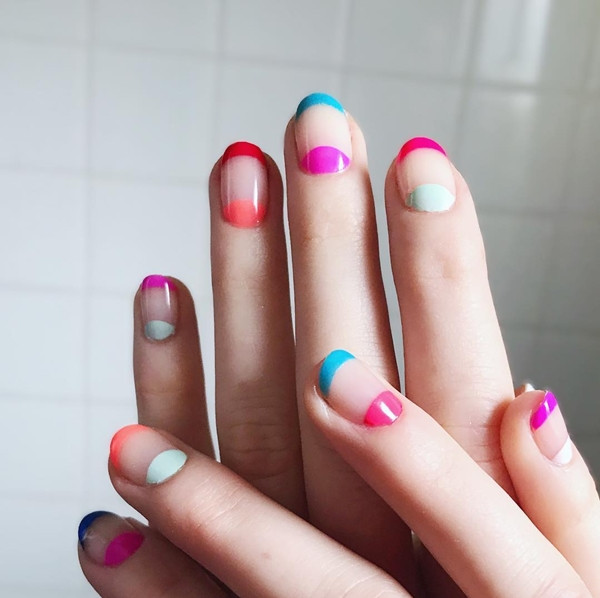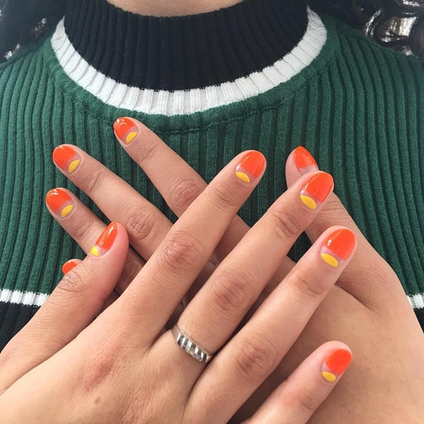 Mẫu móng vầng trăng khuyết hai đầu sử dụng nhiều tone màu nóng.