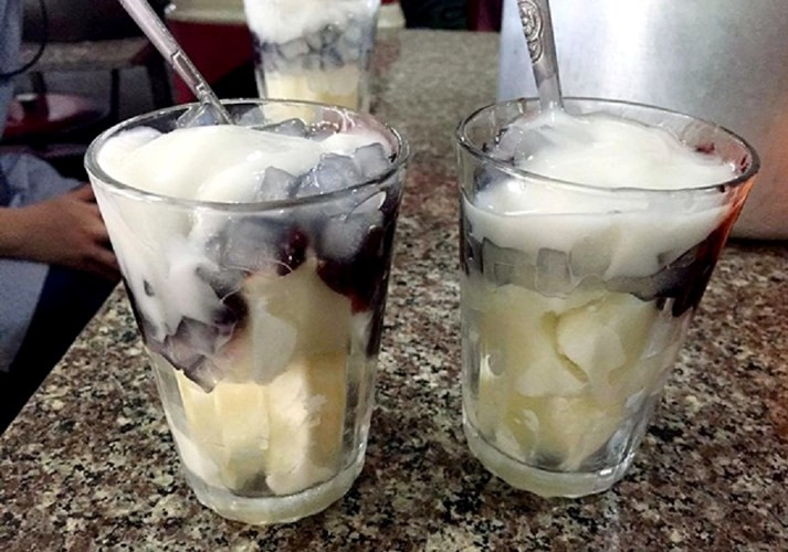 Sữa chua trân châu nước cốt dừa. Sữa chua dẻo lạnh được ăn cùng với trân châu, nước cốt dừa vừa ngậy vừa thơm tạo cảm giác vô cùng thú vị.