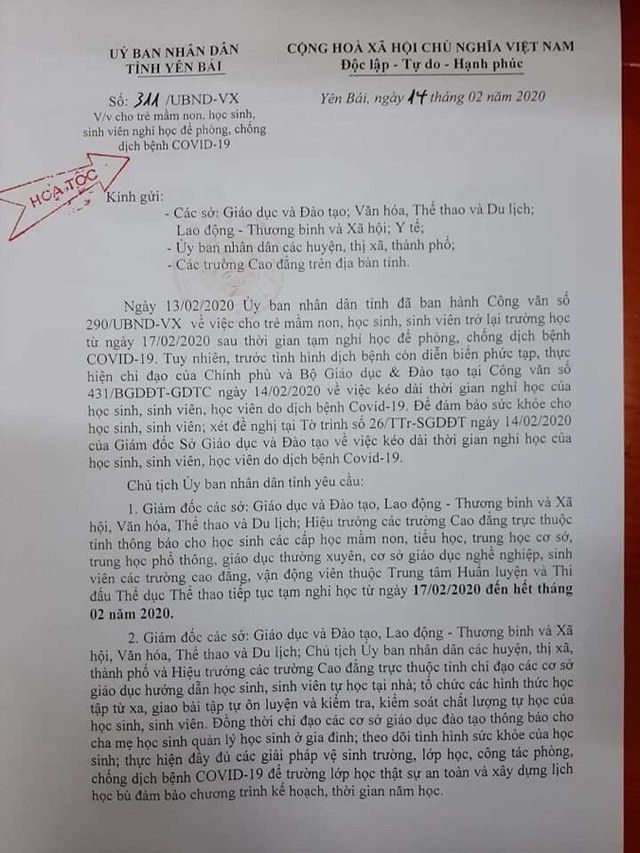 Cụ thể, tối 14/2, UBND tỉnh Yên Bái đã có công văn hỏa tốc thông báo cho học sinh, sinh viên trong tỉnh tạm nghỉ học đến hết tháng 2/2020 bởi vì tình hình dịch bệnh Covid-19 còn diễn biến phức tạp.