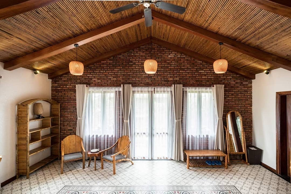 Nội thất bài trí theo phong cách nhẹ nhàng và tinh tế, nổi bật với gam màu đỏ ấm. Phòng ở đây có giá từ 1,8 triệu/đêm.