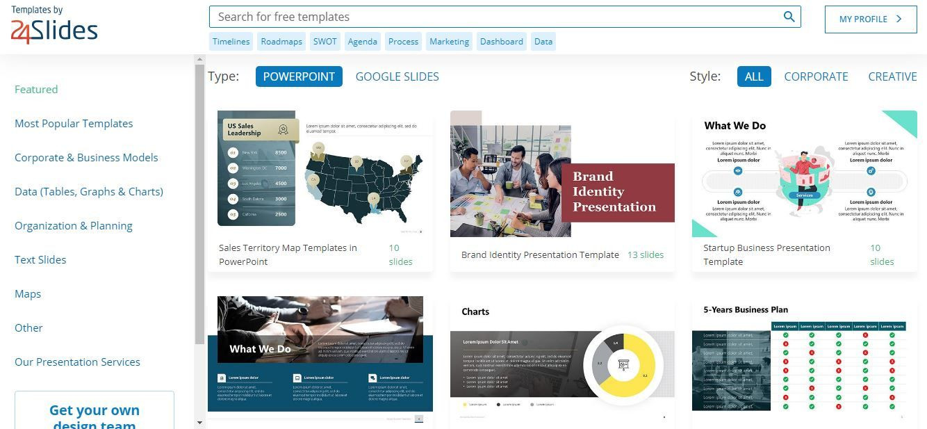 24Slides là lựa chọn không bao giờ sai! Sở hữu các mẫu thiết kế trang trình bày chuyên nghiệp cũng như dễ tìm, dễ sử dụng vì được sắp xếp theo các danh mục như chủ đề và theo xu hướng. Ưu điểm to lớn tại 24Slides là không có bất kỳ quảng cáo nào trong quá trình sử dụng nên sẽ rất thuận tiện trong việc tìm kiếm của bạn.