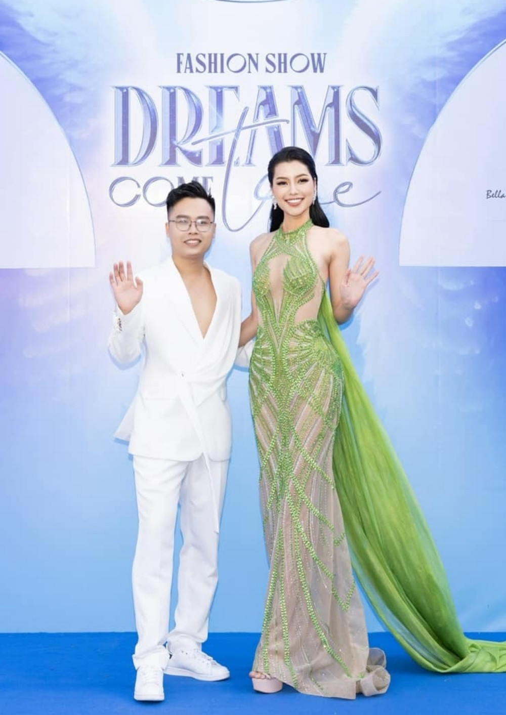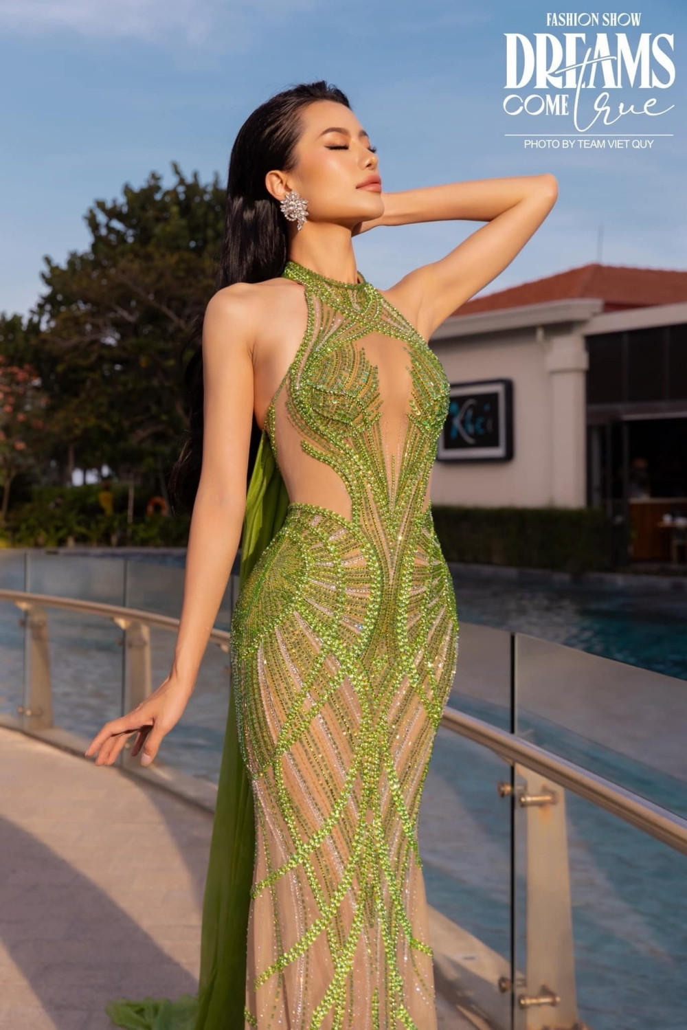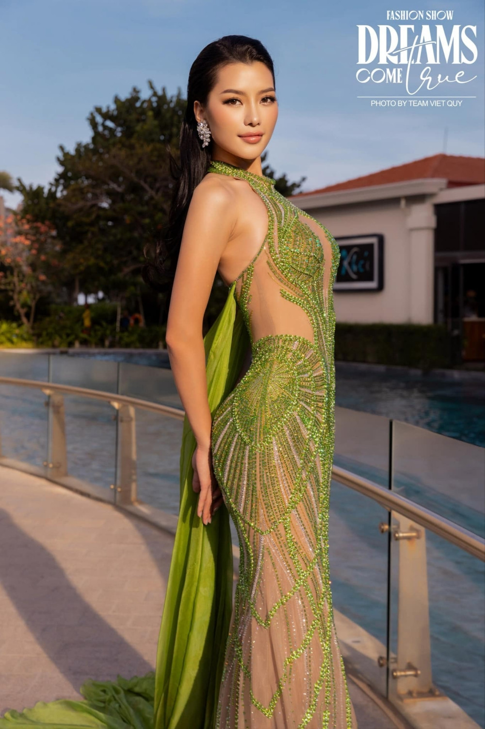 Xuất hiện tại sự kiện thời trang ra mắt BST Dreams Come True của NTK Nguyễn Minh Tuấn sau đăng quang Á hậu Hoa hậu Hoàn vũ Việt Nam (Miss Cosmo Vietnam) 2023, Hoàng Thị Nhung diện thiết kế dạ hội lấp lánh màu xanh ôm sát, khoe trọn thân hình “đồng hồ cát”.
