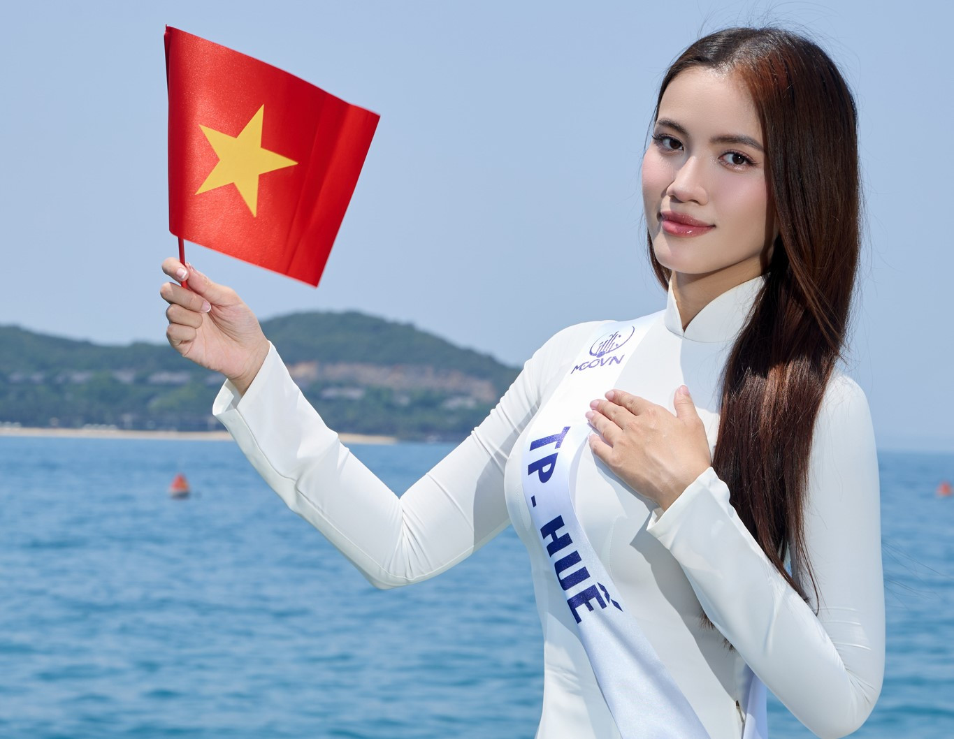 Giữa không gian bao la của biển trời Tổ quốc, hình ảnh Minh Nhàn trong tà áo dài truyền thống giản dị nhưng đầy kiêu hãnh, nổi bật với lá quốc kỳ trên tay, đã chạm đến trái tim nhiều người. 'Mỹ nhân xứ Huế' chọn lối tạo dáng mộc mạc, không cần cầu kỳ, truyền tải thông điệp tinh thần kiên cường của con người Việt Nam.