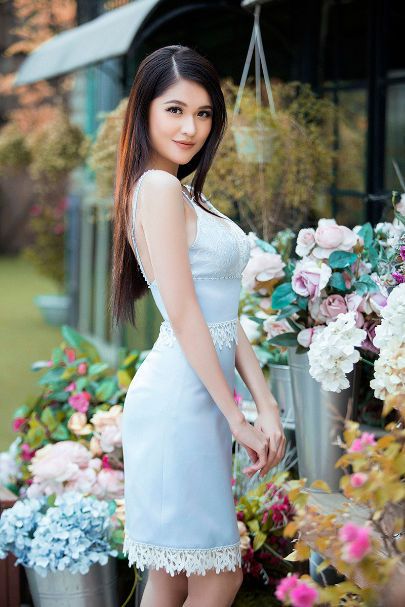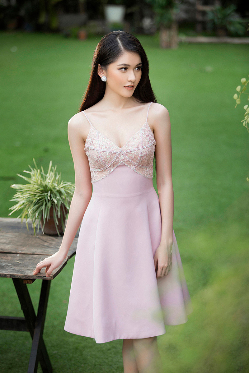 Các loại ren đẹp mắt được NTK lựa chọn kỹ lưỡng để tạo nên điểm nhấn cho các mẫu váy liền thân. Kiểu váy được Đỗ Long thể hiện nhiều nhất là váy hai dây.
