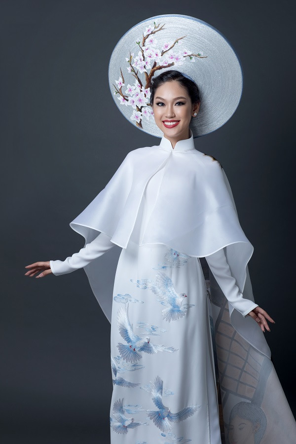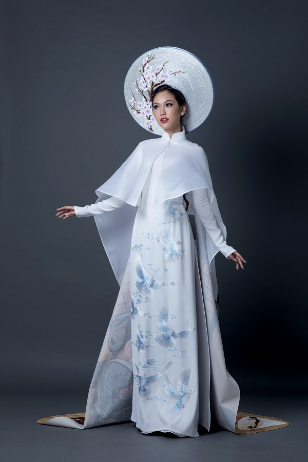 Phía trước của bộ trang phục là hình ảnh những chú chim bồ câu đại diện cho hòa bình đang bay lượn để mang niềm hy vọng, những hoài bão của một thế giới yên vui đi khắp nơi. Phía sau, áo choàng được thiết kế để thể hiện sự sang trọng và quyền lực của người phụ nữ Việt Nam. Tuy nhiên, điểm quan trọng chính là áo choàng có hình người phụ nữ Nhật Bản trong trang phục kimono mời trà đạo người phụ nữ Việt Nam mặc áo dài, bên cạnh là hình ảnh của đóa hoa sen - quốc hoa của Việt Nam và chiếc nón lá.