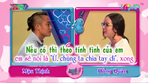 Hồng Quân trả lời: “Nếu có theo tính tình của em, em sẽ nói: Ừ mình chia tay đi”. Mậu Thịnh tỏ ra thất vọng và anh nói rằng mình cần tìm một người chín chắn.