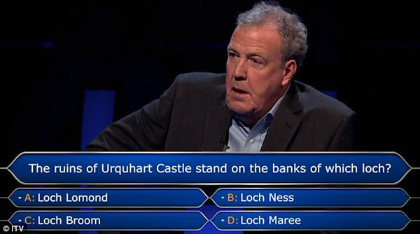 MC Jeremy Clarkson đã đọc câu hỏi thứ 12 dành cho người chơi Gareth rằng phế tích lâu đài Urquhart nằm bên bờ hồ nào.