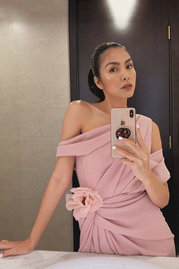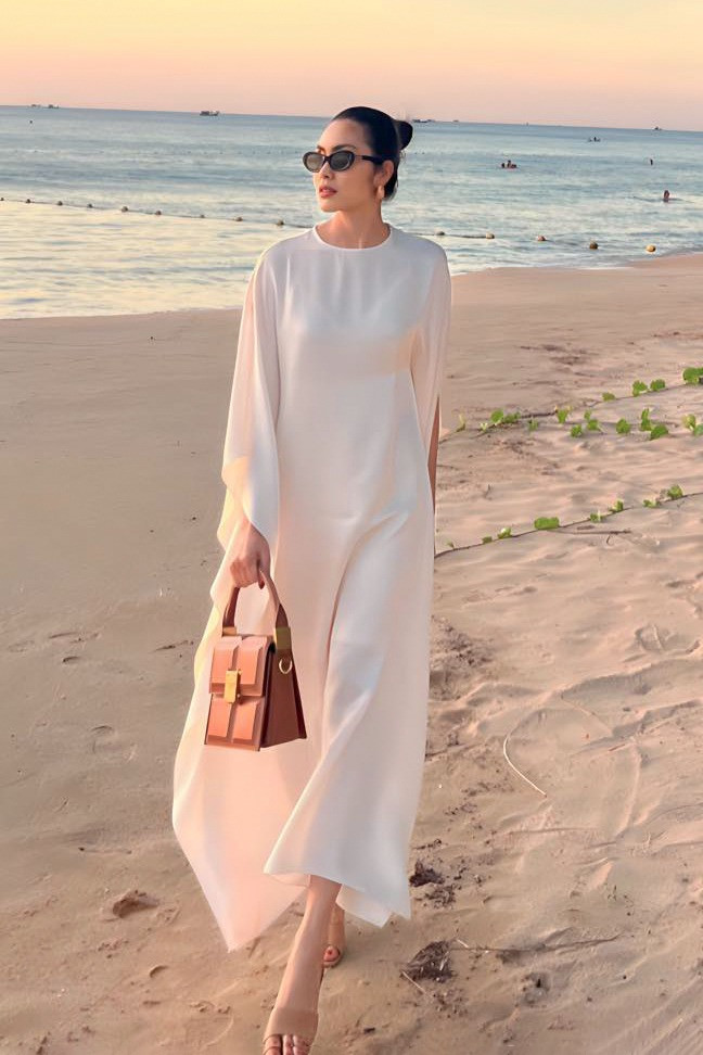 Nữ diễn viên luôn giữ nguyên tắc chọn váy đơn sắc với tông màu trang nhã như kem, be, tro của hoa hồng, cam đất cùng chất liệu mềm mại, bay bổng khi tham dự tiệc cưới. Thiết kế của những bộ váy này nhấn nhá vào những chi tiết cắt may khéo léo chứ không nghiêng về đính kết cầu kỳ.
