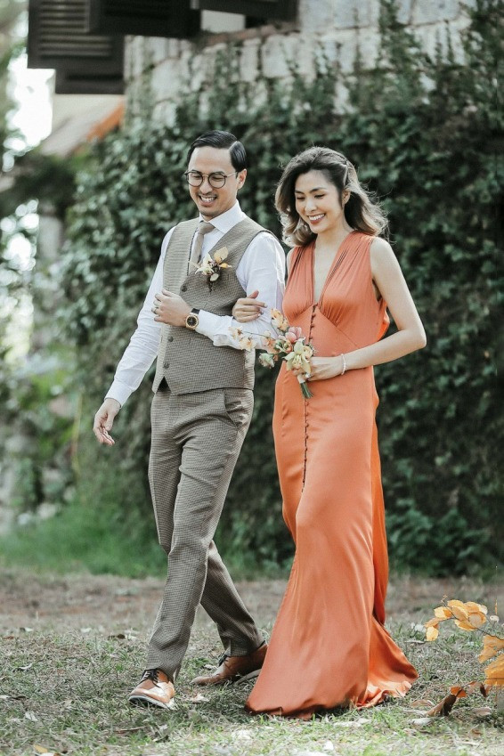Chỉ cần một bộ váy xéo vai mềm mại với những đường rủ trên vai, hoặc mẫu váy cam đất có hàng khuy bọc vải chạy dọc theo thân là đủ để Tăng Thanh Hà tỏa sáng, thu hút mọi ánh nhìn trong tiệc cưới.