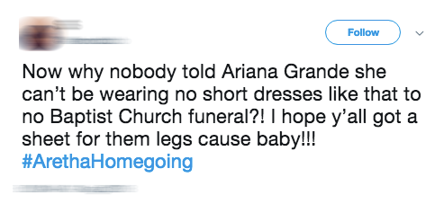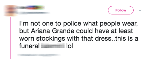"Tôi không phải cái kiểu thích phán xét người ta mặc gì nhưng Ariana Grande có thể ít nhất mang thêm tất cùng chiếc đầm ngắn ngủn đó không. Đây là tang lễ mà.."