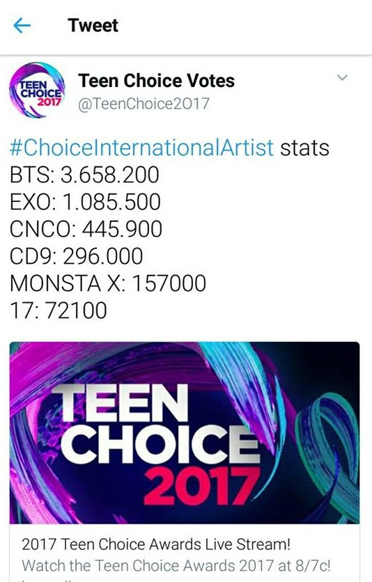 Lễ trao giải Teen Choice Awards 2017 được tổ chức tại trung tâm Galen, Los Angeles vào tối ngày 13/8 theo giờ địa phương. Danh sách đề cử cho hạng mục Choice International Artist được bất ngờ công bố ngay trước thềm lễ trao giải và các fandom chỉ có thời gian vỏn vẹn 6 tiếng để bình chọn cho thần tượng của mình thông qua Twitter (từ 11h đêm 13/8 đến 5h sáng ngày 14/8 theo giờ Việt Nam). Hầu như các fandom đều không kịp chuẩn bị tinh thần và fan châu Á bị ảnh hưởng khá nhiều vì thông báo bất ngờ của Ban tổ chức do lệch múi giờ. Dù vậy, BTS vẫn giành chiến thắng áp đảo với hơn 3,6 triệu lượt bình chọn (cách vị trí thứ 2 hơn 2,5 triệu lượt) trước các đối thủ nặng kí như EXO, MONSTA X, SEVENTEEN, nhóm nhạc người Mexico CD9 và nhóm nhạc người Mỹ Latin CNCO.