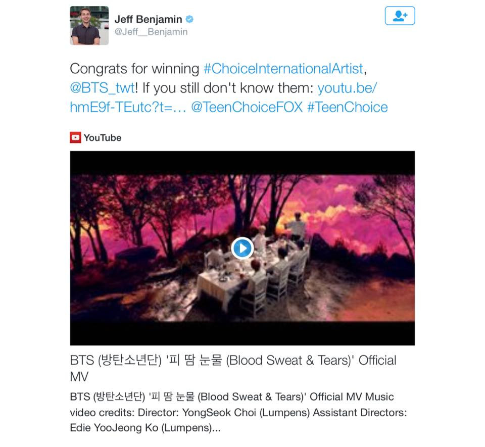Thành viên Joel Pimentel của nhóm nhạc CNCO, MC Liam McEwan, Clevver TV, Jeff Benjamin,... đã tweet chúc mừng BTS thắng giải thưởng này.