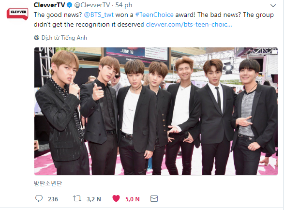 Hiện tại, BTS là nghệ sỹ K-Pop thứ hai nhận được giải thưởng Choice International Artist tại Teen Choice Awards, sau tiền bối Super Junior vào năm 2015. Đây là giải thưởng quốc tế thứ 2 BTS nhận được sau Top Social Artist tại Billboard Music Awards hồi tháng 5 năm nay.