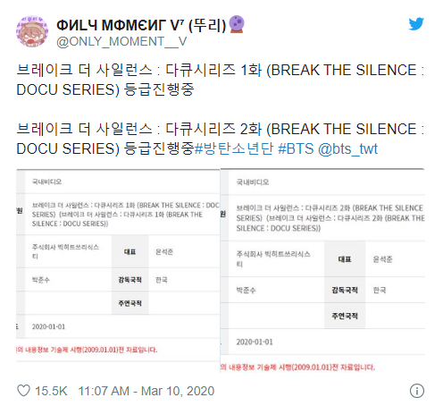 Vào ngày 10/3, các ARMY rất hào hứng khi nghe tin một bộ phim mới về BTS hiện đang trong quá trình đăng ký xét duyệt để phát hành trong thời gian tới. Được biết, Big Hit đã đăng ký các tên gọi sau: Break The Silence: Docu Series 1 và Break The Silence: Docu Series 2.