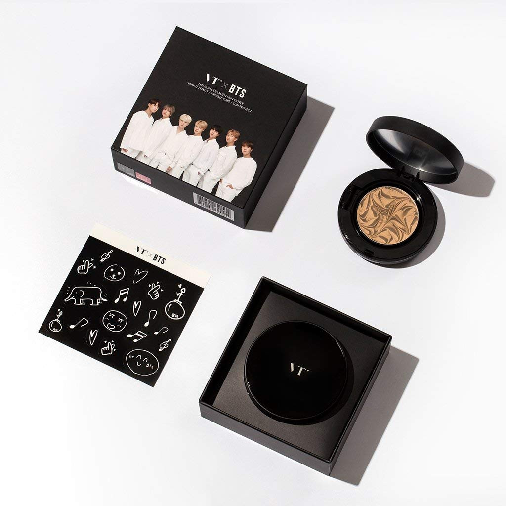 Nắm rõ được thế mạnh ấy, BTS đã “mạnh dạn” bắt tay cùng hãng mỹ phẩm Hàn Quốc có tên VT Cosmetics cho ra đời bộ sưu tập đồ trang điểm “made by BTS”. Bộ sưu tập gồm những sản phẩm làm đẹp cơ bản mà bất cứ chàng trai nào cũng nên có như cushion, tinted foundation (kem nền dạng tint), phấn mắt và son thỏi dạng lì.