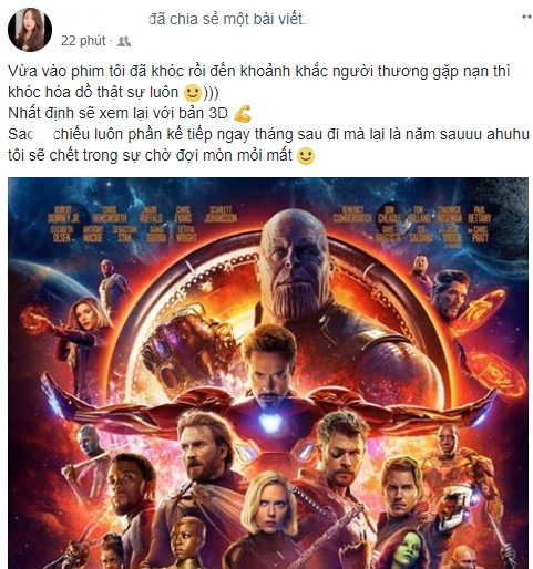 Trước Infinity War, nhiều giả thuyết đã được tung ra nhưng đến khi phim chính thức ra rạp, khán giả vẫn bị “sốc” thực sự. Một tác phẩm khiến công chúng cười ồ, hô vang sung sướng và khóc hết nước mắt. Để rồi sau đó, người xem lại “điên cuồng” chờ đến mùa Hè năm 2019 để được xem nốt đoạn kết của bản anh hùng ca bi tráng của Marvel.
