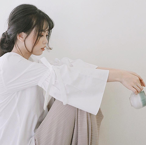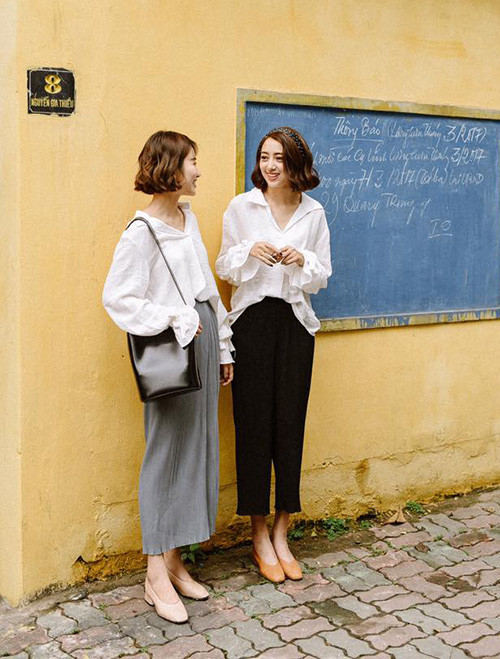 Sơ mi tay dài loe nhẹ cũng là lựa chọn đáng thử vì thích hợp với thời tiết sang Thu.