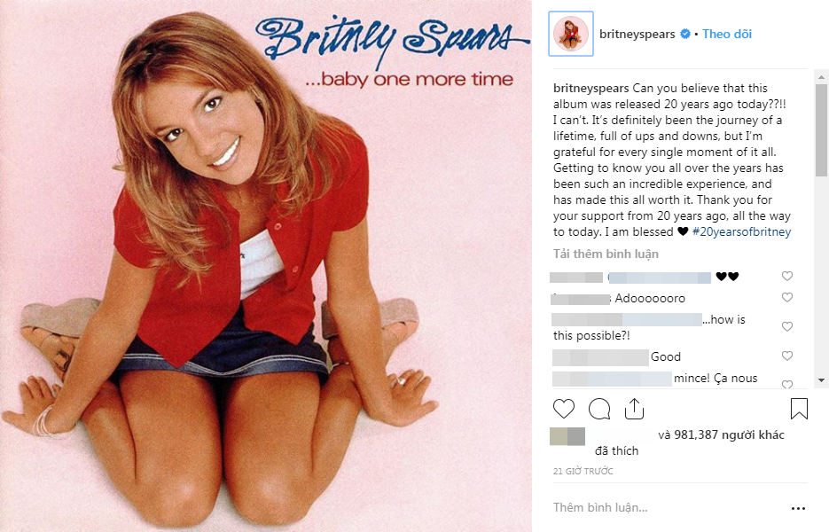 Nữ ca sĩ tâm sự: “Các bạn có thể tin được là album này đã 20 tuổi rồi không??!! Tôi thì chẳng thể tin được!”. Nói về chặng đường sự nghiệp của mình, Britney chia sẻ: “Đây đúng là một hành trình ý nghĩa, đầy ắp thăng trầm nhưng tôi thật sự biết ơn nó. Được biết và đồng hành cùng các bạn trong những năm qua là một trải nghiệm hết sức tuyệt vời và xứng đáng. Cảm ơn sự tin tưởng và ủng hộ của mọi người trong suốt 20 năm qua. Tôi thật sự rất may mắn khi gặp được các bạn! #20nămBritney”.