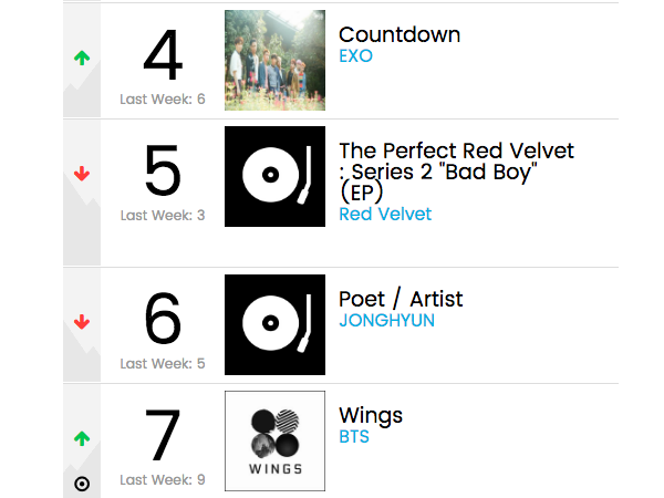 Ở những bảng xếp hạng khác trên Billboard tuần này, The Perfect Red Velvet của Red Velvet đứng ở vị trí thứ 5 trên BXH Album Thế giới (World Albums chart) sau khi đứng ở vị trí thứ 3 vào tuần trước. Trong khi đó, Bad Boy đứng thứ 2 trên BXH Các ca khúc nhạc số bán ra (World Digital Song Sales chart).