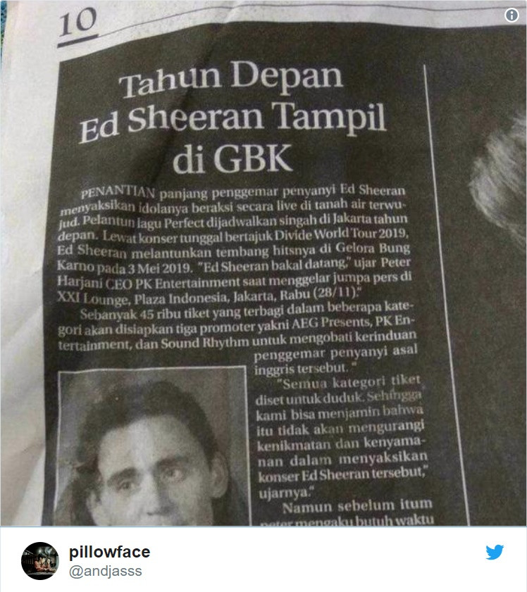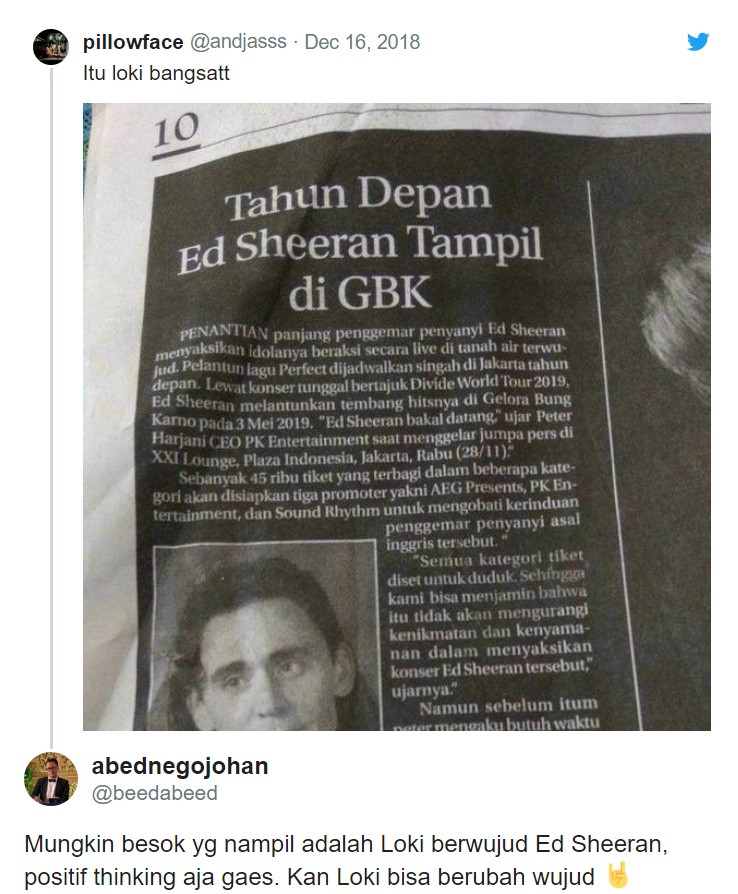 Có lẽ tờ báo này ở Insonesia đã thất bại trong việc phân biệt một người bước ra từ thế giới siêu anh hùng - Tom Hiddleston/Loki - và một nghệ sĩ nổi tiếng, tài năng của nước Anh - Ed Sheeran. Hình ảnh chụp lại dòng tin đã đã nhanh chóng lan truyền trên các trang mạng xã hội ở Indonesia.