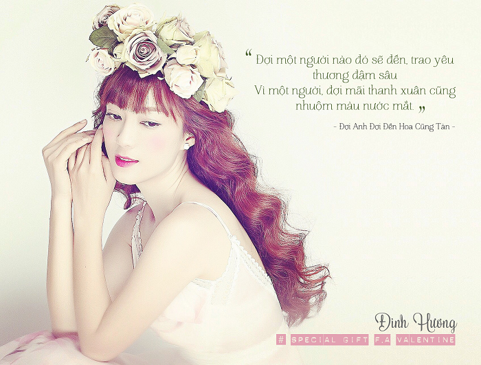 Điều đặc biệt hơn cả, với Đợi anh đợi đến hoa cũng tàn, Đinh Hương lại muốn dành tặng riêng ca khúc này cho các F.A (hội độc thân) trong ngày Valentine cùng lời chia sẻ rằng: “Bài hát này Hương dành tặng riêng cho mọi trái tim đang bơ vơ một mình và cả những người dù đã “hai mình” nhưng vẫn cảm thấy cô đơn trong mùa Valentine. Bất kì ai cũng xứng đáng để có một tình yêu chờ đợi bạn ở phía cuối con đường. Dù đó có thể chỉ là một thứ tình yêu không trọn vẹn, thế nhưng thật may mắn bởi vì ít nhất trong cuộc đời ta vẫn có một ai đó xứng đáng để nhớ, đợi chờ và yêu thương mỗi ngày. Vậy nên, hãy cứ khát khao, hãy cứ dại khờ và hãy cứ đợi nhau, đợi đến hoa cũng tàn các bạn nhé!”.