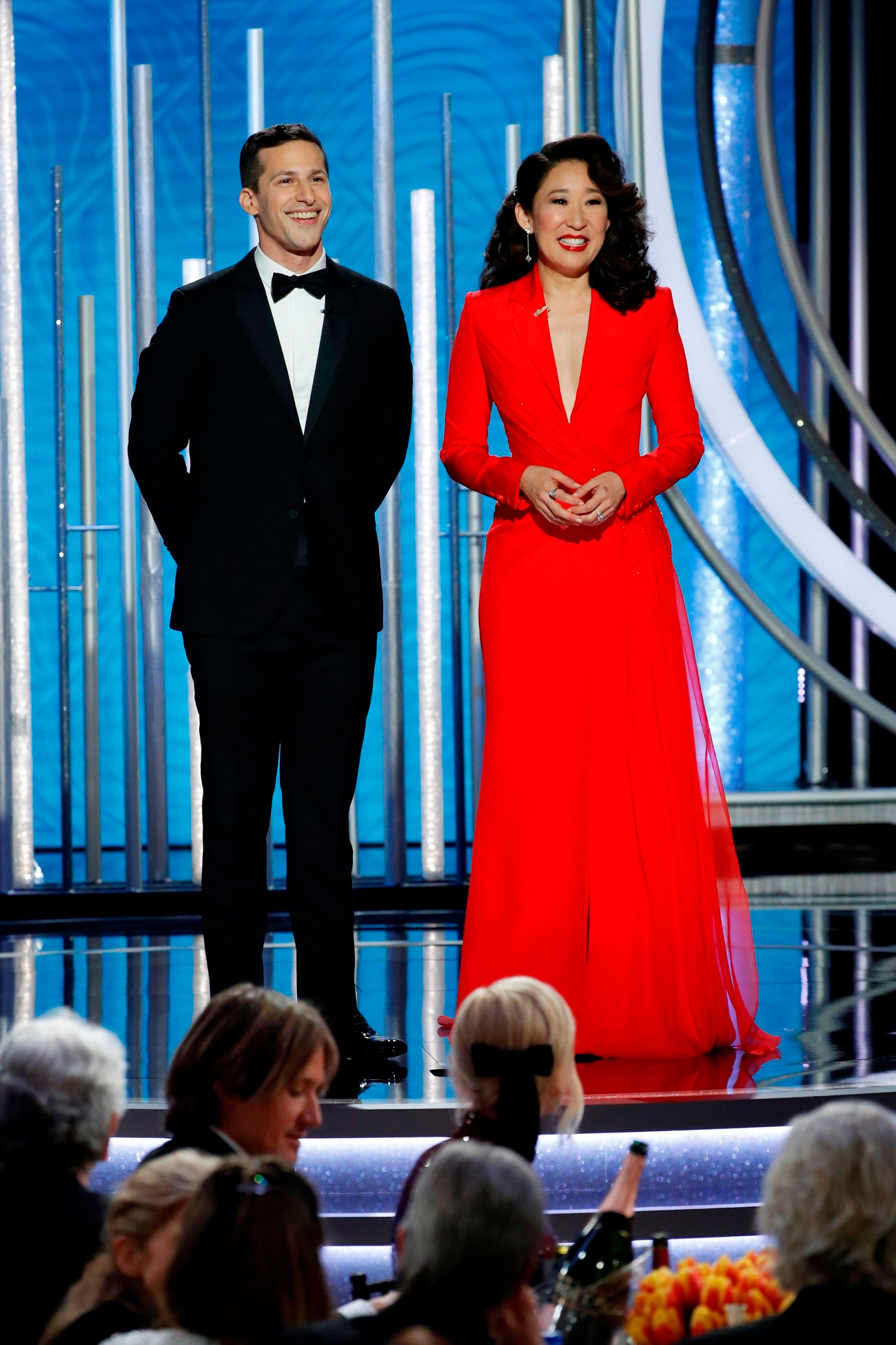 Sau đó, để mở màn chương trình, Sandra Oh đã thay cho mình chiếc đầm màu đỏ rực rỡ.
