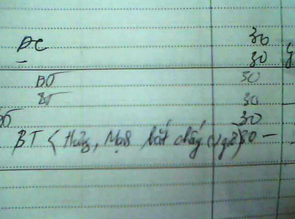 "Là thế này! Con bạn học nó ăn vụng bánh tráng sau đó thổi cái bịch lên đập, rồi thầy tra hỏi đứa nào làm, cả lớp đùn đẩy đùn đẩy bảo là có bạn đi ngang lớp làm! Sau đó thầy phê vô sổ đầu bài là "Khủng bố thầy" - Mộng Tuyền.
