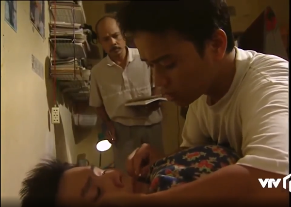 Nghĩa cho bạn uống thuốc để lấy lòng tin của bác chủ nhà.