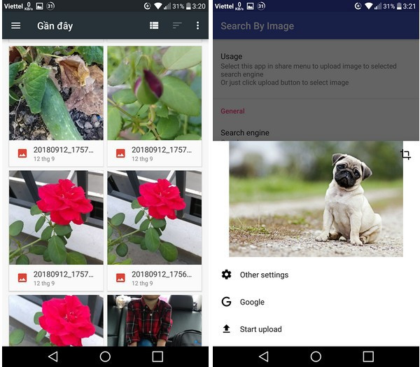 Sau khi nhấn vào nút này, ứng dụng sẽ cho phép người dùng chọn hình ảnh cần tìm kiếm thông tin trên Google từ smartphone. Bạn có thể chọn hình ảnh đã được chụp bằng camera trên smartphone hoặc đã được lưu về từ Internet để tìm kiếm trên ứng dụng. Sau khi chọn được hình ảnh cần tìm kiếm, nhấn nút Start upload từ menu hiện ra.