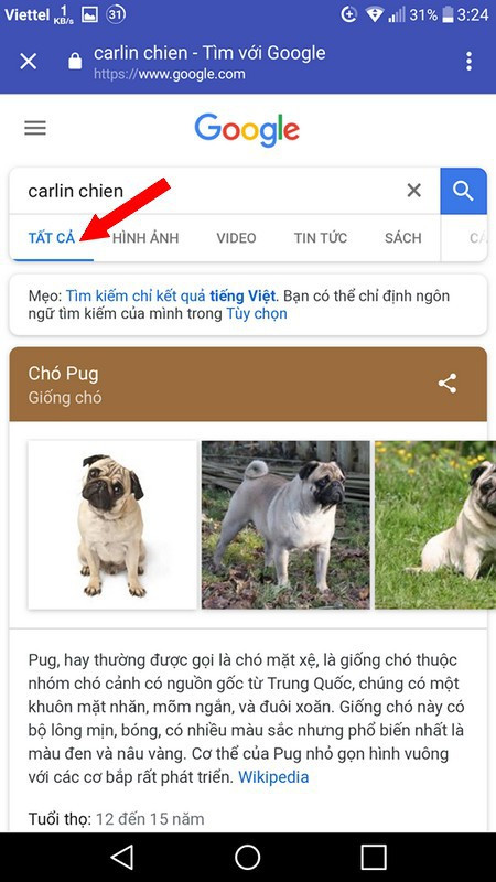 Để biết rõ hơn thông tin về đối tượng có trong hình ảnh bạn đã tìm kiếm, bạn nhấn tab “Tất cả” ở kết quả tìm kiếm trên giao diện ứng dụng, lập tức từ khóa liên quan đến hình ảnh sẽ được hiển thị (ở dạng tiếng Việt), giúp bạn có thể biết rõ về đối tượng có trong ảnh mình cần tìm kiếm.