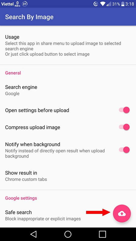 Giao diện chính của Search by Image sẽ hiển thị các tùy chọn để người dùng thiết lập cách sử dụng và hoạt động của ứng dụng. Giao diện này bằng tiếng Anh, nhưng bạn chỉ việc để nguyên như thiết lập mặc định, không cần phải thay đổi thiết lập nào nên cũng không cần quá bận tâm đến giao diện của ứng dụng.