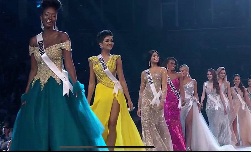 Váy dạ hội của H'Hen Niê có màu sắc nổi bật trong nhóm thí sinh cuối, có tới 2/3 người đẹp chọn trang phục ánh kim trong phần thi dạ hội này. Những bước đi với thần thái tự tin giúp người đẹp Việt nổi bật giữa dàn mỹ nhân cực mạnh trong cuộc thi Miss Universe 2018.