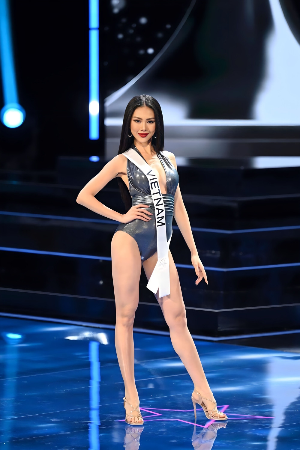 Hoa hậu Bùi Quỳnh Hoa đại diện Việt Nam xuất hiện trong layout trang điểm sắc sảo với điểm nhấn son môi đỏ.
