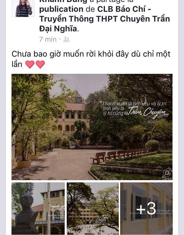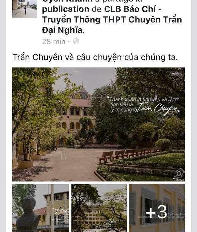 Ai nói ngôn tình chỉ có trong truyện, trên phim, thì ắt hẳn chưa bao giờ là một mảnh ghép của Trần Chuyên. Từ vườn sứ mà cô Tâm dạy Sử “thương mến” gọi là “vườn yêu” vì là nơi các cặp “gà bông” thường hay tâm sự, cho tới các dãy hành lang kiểu Pháp mà lãng mạn những tưởng chỉ có trên phim. Không ai yêu mến Trần Chuyên mà lại không mang trong mình chút máu của nghệ sĩ. Cũng chính vì vậy, CLB Báo Chí - Truyền thông THPT chuyên Trần Đại Nghĩa (Q.1, TP.HCM) vào ngày 31/3/2017, sinh nhật của trường, đã ra mắt một bộ ảnh - rất ít ảnh thôi -nhưng chính những ghi chú quá "ngôn tình" của những bức ảnh khiến TĐN-ers lẫn các anh chị cựu học sinh đều share rất nhiệt liệt.