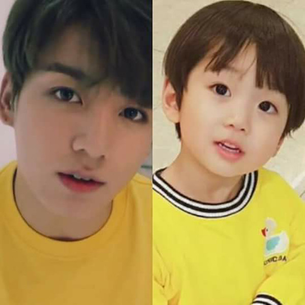 Cậu út của BTS vốn nổi tiếng với đôi mắt to tròn, khi cười sẽ cong cong, làn da trắng và đôi môi hồng chúm chím. Vậy thì Eunwoo không sai chính là phiên bản thu nhỏ của Jungkook rồi.