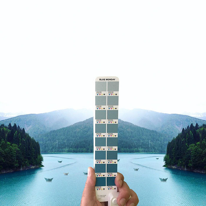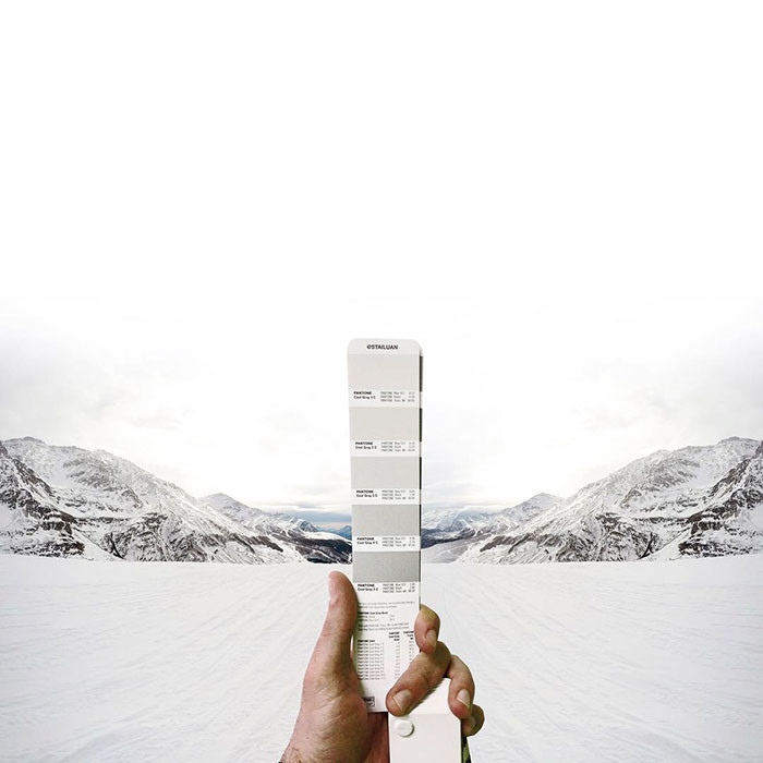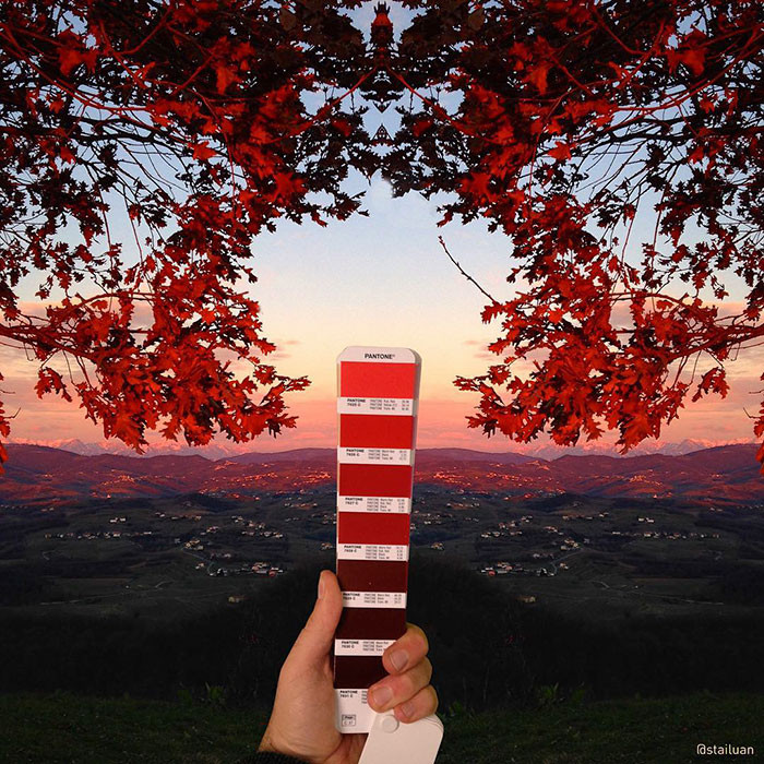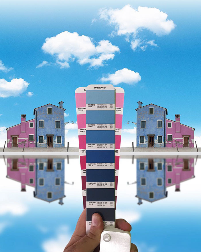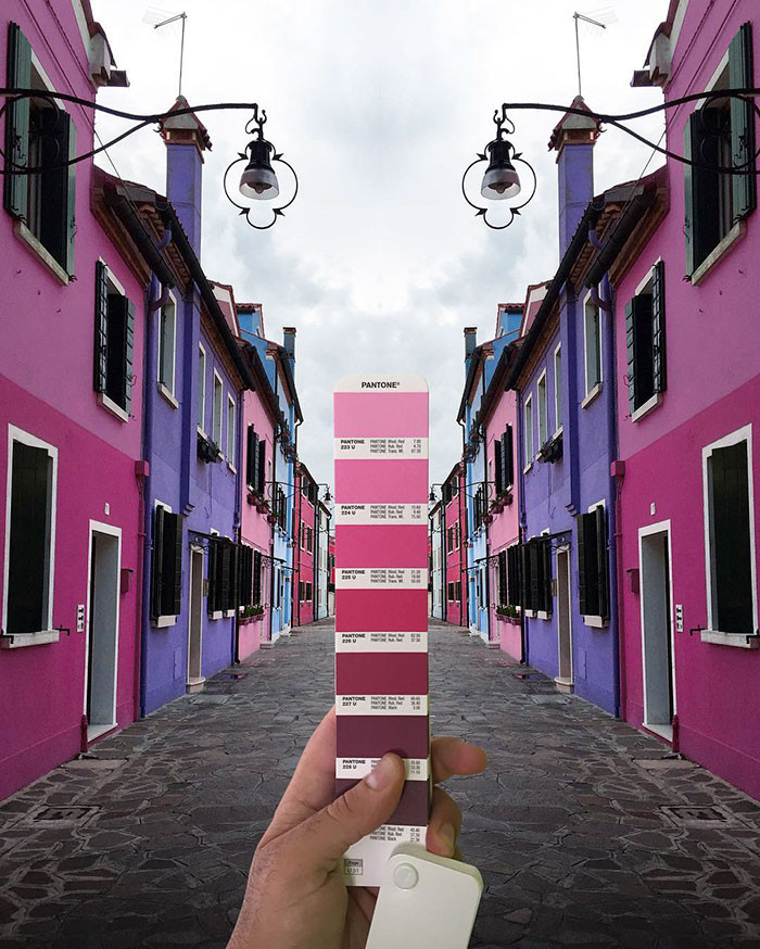 Trong mỗi bức ảnh "bằng chứng" do ông tự tay chụp, Antoni đều cầm một thanh màu Pantone có cách phối "trùng khít" với phong cảnh ở nước Ý. Từ chiếc cây trên đỉnh đồi nhìn xuống thành phố, những tòa nhà sơn màu hồng đáng yêu đến cảnh núi tuyết trắng xóa... tất cả đều thể hiện được rõ đôi mắt nhìn cuộc sống vô cùng tinh tế của Antoni. Thậm chí, ông còn dùng kỹ thuật phản chiếu nhân đôi một số cảnh vật lên để đánh lạc hướng đôi mắt người xem. Cùng Hoa Học Trò nghía thử vài bức hình sau nhé!