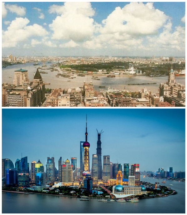 Hình ảnh thành phố Thượng Hải, Trung Quốc năm 1990 của thế kỷ trước so với thời hiện đại.