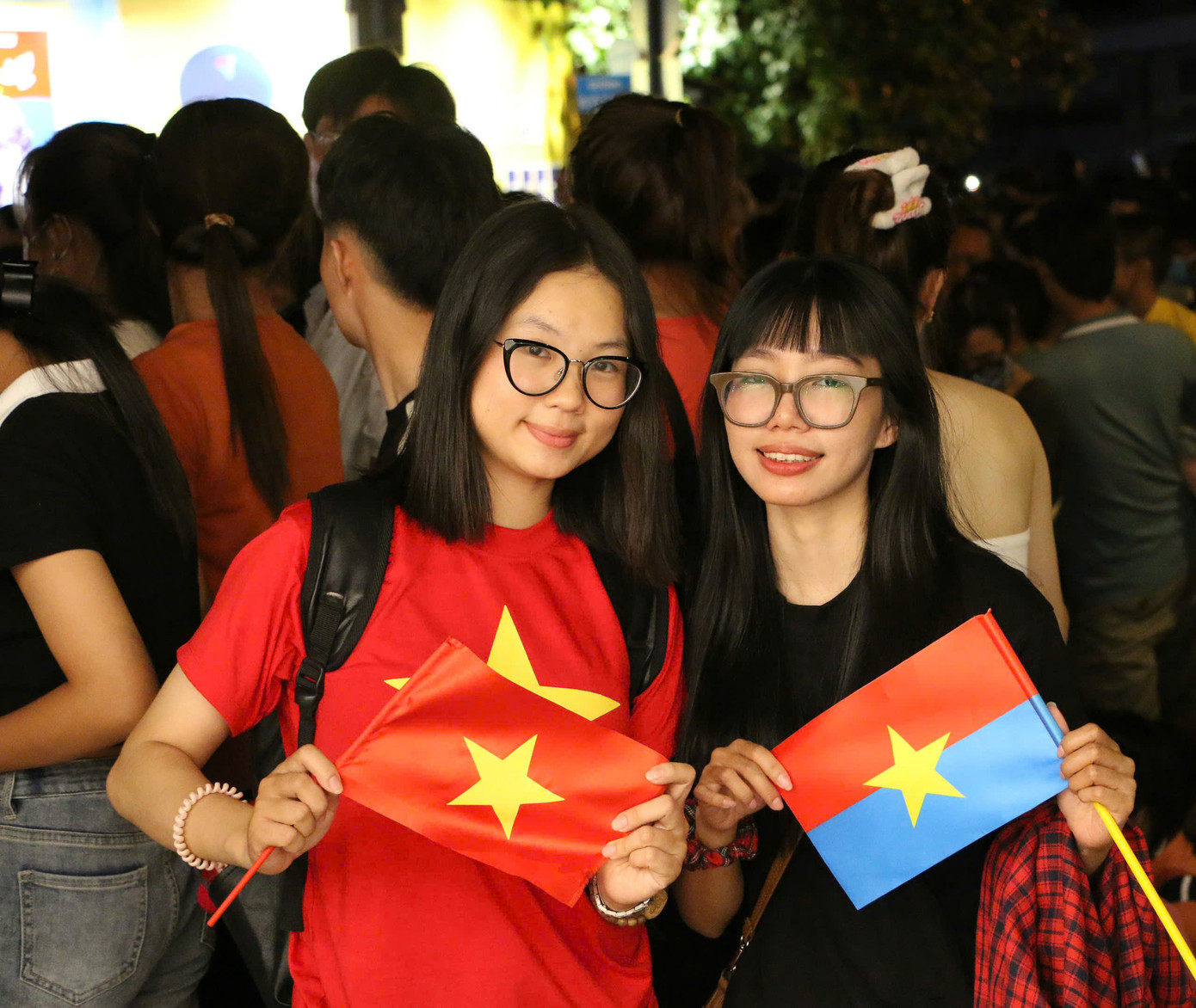 Từ khoảng 18h, khu vực phố đi bộ Nguyễn Huệ, bến Bạch Đằng (Q. 1, TP. HCM) và nhiều tuyến đường quanh trung tâm thành phố bắt đầu đông dần. Trong sắc đỏ rực rỡ của cờ Tổ quốc, nhiều bạn trẻ diện áo cờ đỏ sao vàng, tay cầm cờ tổ quốc hòa mình vào không khí ngày Đại lễ 30/4.