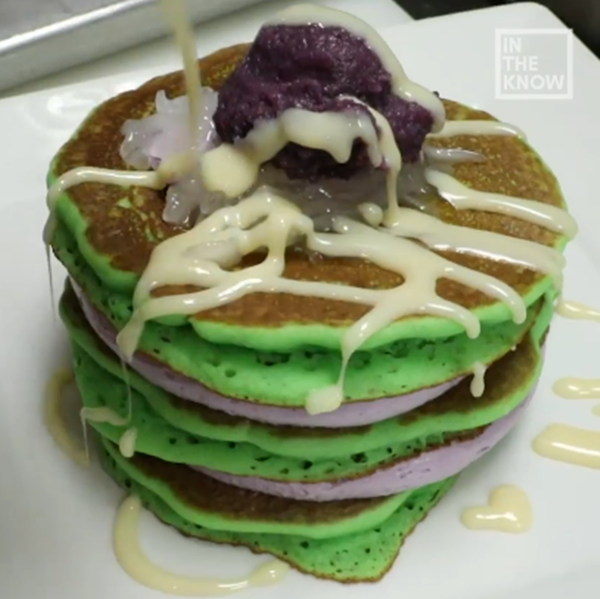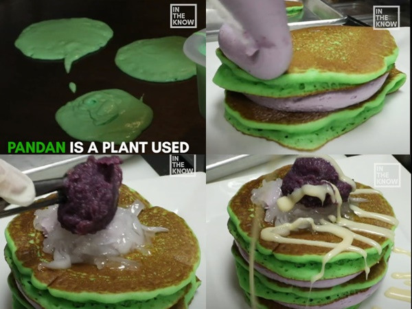 Đó là bánh crepe màu xanh với những lớp kem màu tím và bánh quế với tên gọi Ube. Những chiếc bánh này được bắt nguồn từ những chiếc bánh pancake pandan của người Philippines.