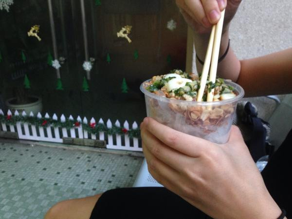 Sinh sau đẻ muộn trong làng ăn vặt Sài Gòn nên bánh tráng trộn thịt bằm khắc phục điểm yếu sau: Thay vì đựng bánh tráng trong bịch, khi cầm dễ dính dầu vào tay, thì bánh tráng trộn thịt bằm được đựng trong ly to (thường dùng để đựng trà sữa size lớn) nên cầm rất tiện, sạch sẽ, ăn chưa xong có thể đóng nắp hộp đem cất, không dơ bàn ghế.