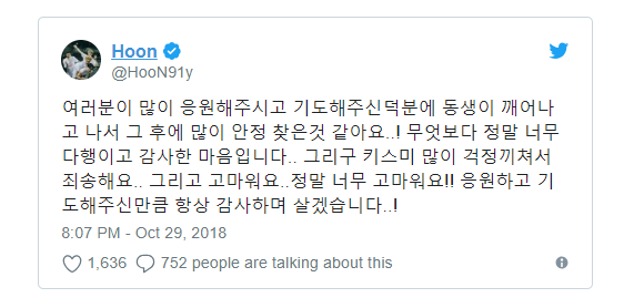 Mới đây, Hoon đã thông báo tin tốt lành về em bé. Theo đó, em bé đã tỉnh lại và tình trạng của em ấy đã ổn định hơn: “Nhờ những lời cầu nguyện của mọi người, em bé đã tỉnh dậy và tình trạng ổn định hơn nhiều…! Hơn bất cứ điều gì khác, tôi cảm thấy nhẹ nhõm và biết ơn... Tôi xin lỗi vì đã làm cho Kiss Me (*) lo lắng... Cảm ơn các bạn ... Cảm ơn các bạn rất nhiều !! Tôi sẽ sống với sự biết ơn trong tim vì những lời cầu nguyện và ủng hộ mà các bạn đã dành cho chúng tôi…!”.