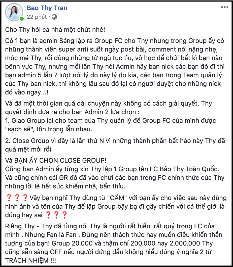 Trong bài đăng của mình, Bảo Thy tuyên bố cứng rắn sau khi group FC lâu năm đóng cửa: