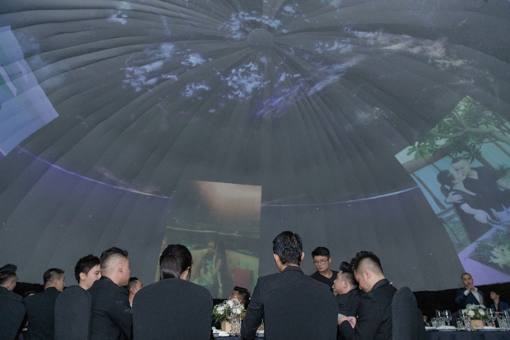 Và cuối cùng, anh trai Bảo Thy đã lựa chọn tổ chức tại một nhà hàng duy nhất sở hữu Dome Theater - Không gian trình diễn tối ưu với hiệu ứng đa chiều từ công nghệ số. Theo chia sẻ từ Thế Bảo, đây là concept tổ chức tiệc đang rất được ưa chuộng tại các nước Châu Âu, Nhật Bản hay Hàn Quốc. Anh hy vọng với những khoảnh khắc hạnh phúc của mình, của gia đình anh được trình chiếu trên màn hình lớn sẽ tạo ra những dấu ấn mạnh mẽ cho những khách mời tham dự.
