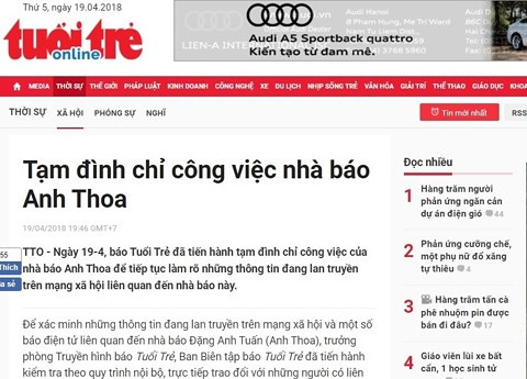 Hiện nay, báo Tuổi Trẻ đã tiến hành tạm đình chỉ công việc của nhà báo Anh Thoa để tiếp tục làm rõ vụ việc.