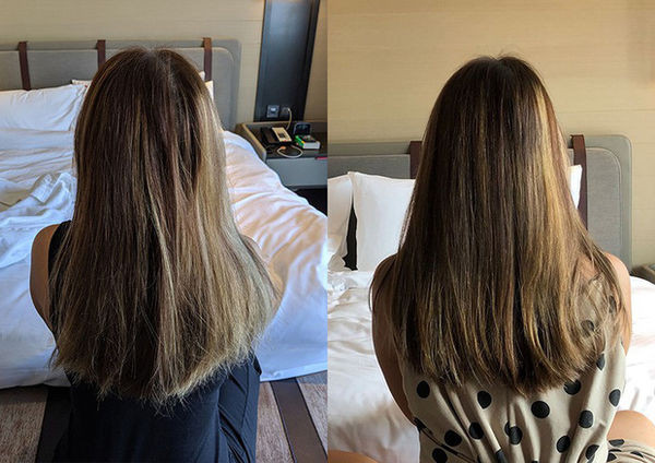 Hình ảnh so sánh mái tóc của Melissa kihi gội đầu bằng cách thông thường (bên trái) và cách gội đầu ngược (bên phải).