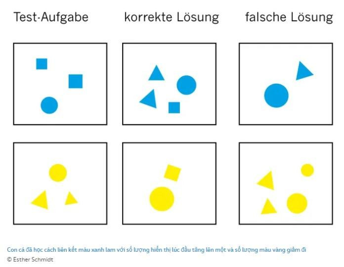 Tiến sĩ Schluessel giải thích: Để huấn luyện cho cá, các nhà nghiên cứu cho chúng lần lượt xem các thẻ bài. Trên thẻ là những ô màu xanh tượng trưng cho phép cộng, và màu vàng tượng trưng cho phép trừ với số lượng khác nhau.