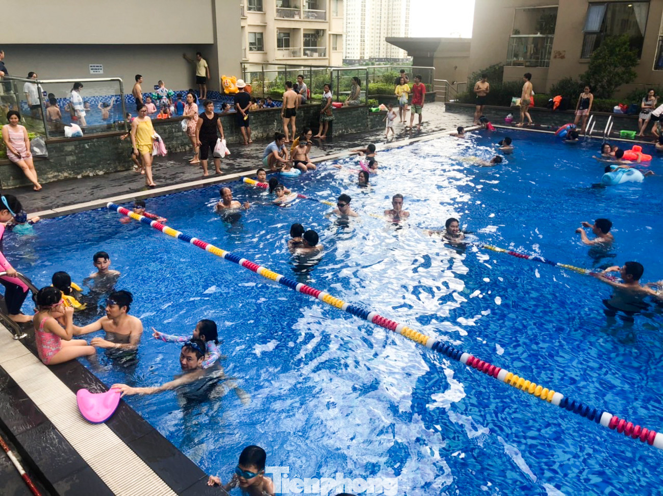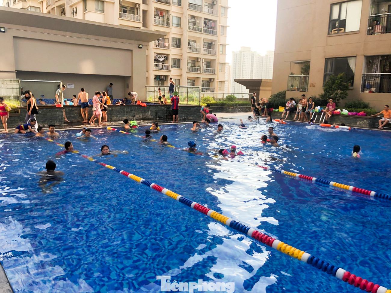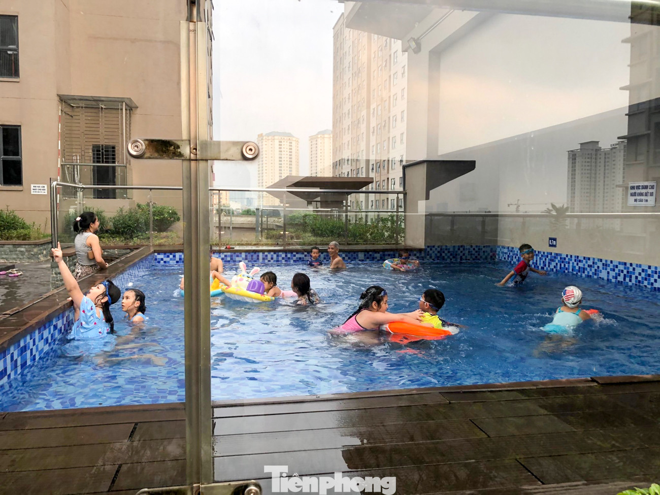 Bể bơi mới đưa vào hoạt động từ cuối tháng 5 nhưng luôn đông người dân đến bơi không chỉ là cư dân của toà chung cư VOV Mễ Trì.