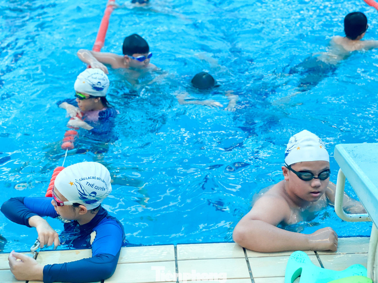 Để tránh không khí oi bức, nhiều gia đình ở Hà Nội tranh thủ đưa con đến bể bơi 'giải nhiệt' ngay từ sáng sớm và sau giờ học.
