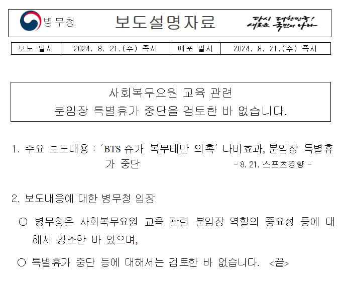 Tờ Sports Kyunghyang đưa tin “độc quyền” về việc ngày nghỉ đặc biệt của đội trưởng và các đồng đội tại cơ quan giáo dục cộng đồng sẽ bị hủy bỏ do ảnh hưởng từ sự việc của SUGA. Đây cũng là trang báo đăng tải đơn khiếu nại của một người dùng ẩn danh về sự thiếu nghiêm túc trong quá trình phục vụ cộng đồng của SUGA. Ngay sau đó, Cục Quân vụ đã nhanh chóng phát hành thông cáo bác bỏ thông tin trên, khẳng định chưa từng có việc xem xét hủy bỏ ngày nghỉ đặc biệt. Hành động này của Sports Kyunghyang bị cho là một điển hình cho việc “phun mù” dư luận, khiến nam rapper bị chỉ trích nặng nề hơn.